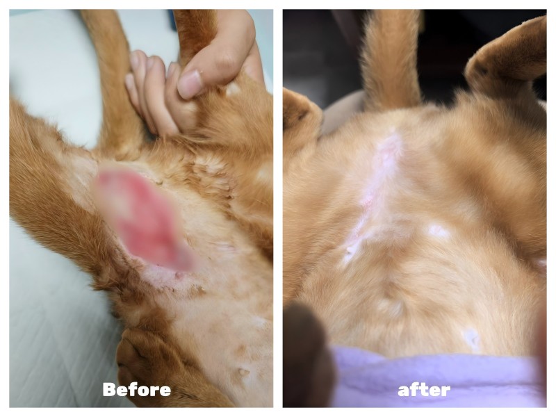 విజయవంతంగా జన్మనిచ్చిన తరువాత, పిల్లి Nuonuo దురదృష్టవశాత్తు క్షీర గ్రంధి చీలికను అభివృద్ధి చేసింది. ఈ పరిస్థితి నుయోనువోకు చాలా బాధ కలిగించడమే కాకుండా కొత్తగా పుట్టిన పిల్లులపై కూడా ప్రభావం చూపింది. ఈ విసుగు పుట్టించే సమస్యను ఎదుర్కొంటూ, రుయిపాయ్ కెనువో పెట్ హాస్పిటల్లోని వెటర్నరీ బృందం, వారి గొప్ప క్లినికల్ అనుభవం మరియు గొప్ప వృత్తిపరమైన అంతర్దృష్టులపై ఆధారపడి, దృఢంగా ఉపయోగించిందిఅధునాతన VETMEDIX వెటర్నరీ లేజర్Nuonuoకి ఖచ్చితంగా చికిత్స చేయడానికి. సాంప్రదాయిక గాయం చికిత్స పద్ధతులతో పోలిస్తే, లేజర్ థెరపీ మరింత విశేషమైన ప్రభావాలను చూపింది. ఇది Nuonuo యొక్క క్షీర గ్రంధి చీలిక యొక్క వైద్యం వ్యవధిని బాగా తగ్గించింది మరియు గణనీయమైన నివారణ ప్రభావాలతో గాయం నయం చేసే హైపర్ప్లాసియా సంభావ్యతను తగ్గించింది. ఎనిమిది రోజుల సమర్థవంతమైన వృత్తిపరమైన చికిత్స తర్వాత, Nuonuo యొక్క శారీరక స్థితి గణనీయంగా మెరుగుపడింది మరియు వైద్యం పరిస్థితి బాగుంది.